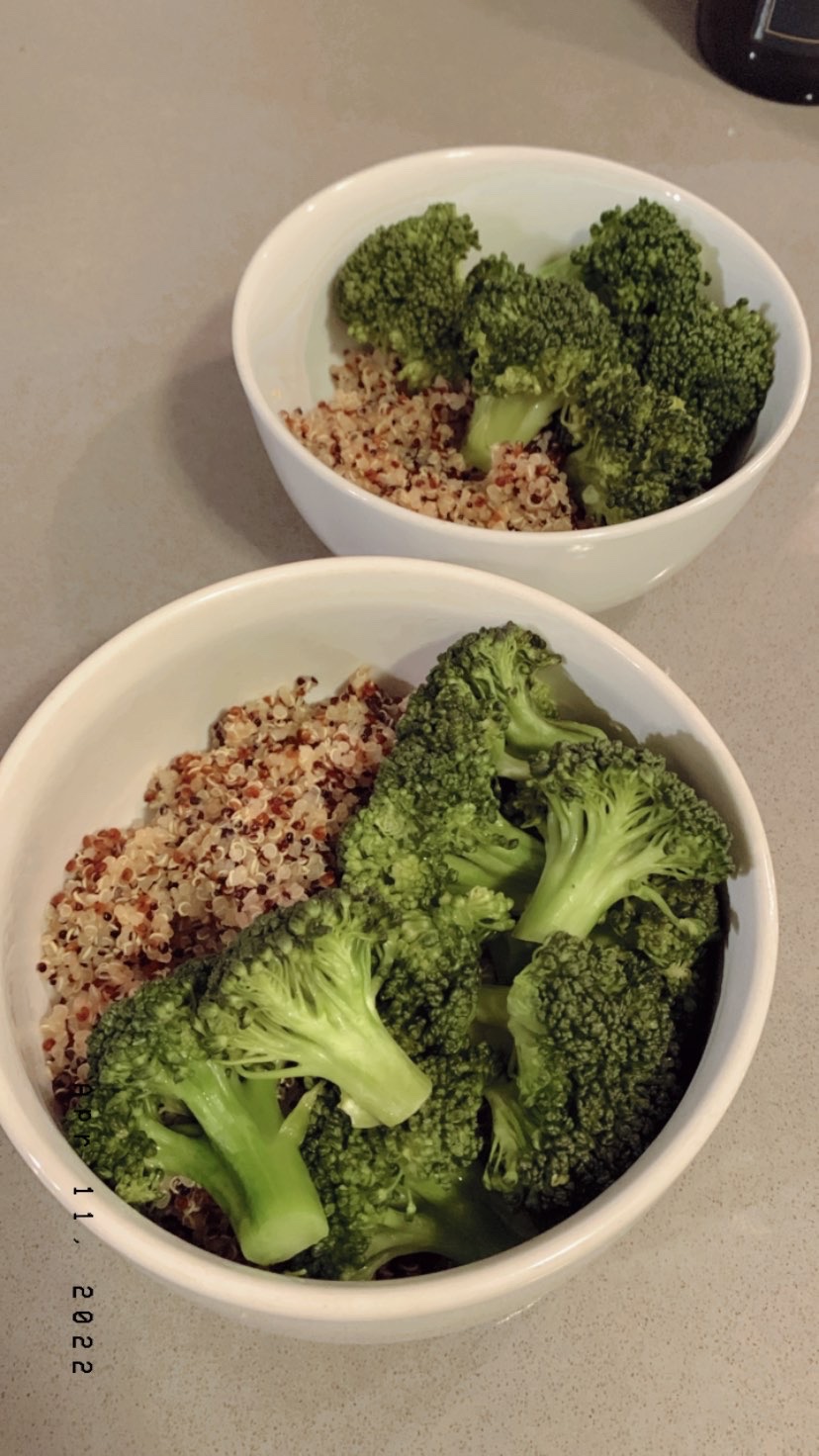 Start your quinoa first. Cook it according to package details. Make sure to rinse your quinoa first! 1 cup quinoa – 2 cups water. Bring to boil and cover & cook for 15min. Let rest for 15-20min then fluff.