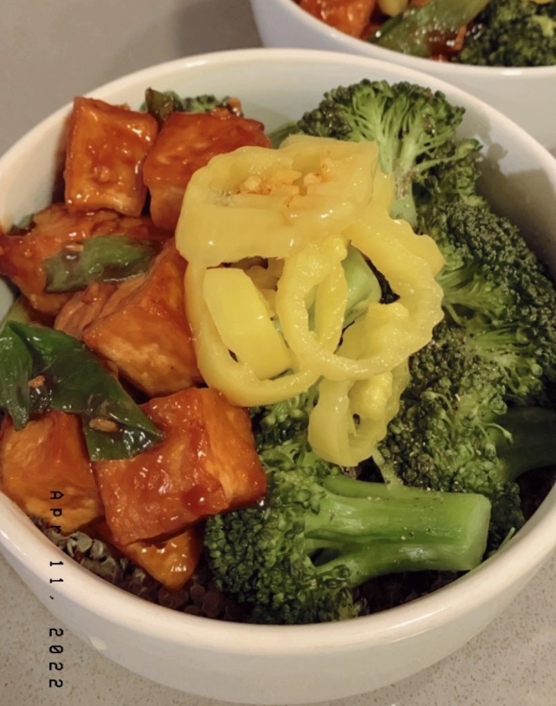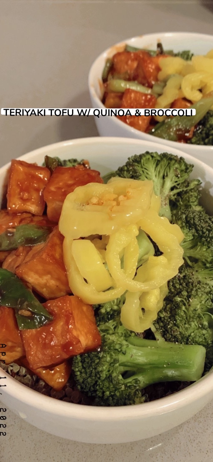 This teriyaki tofu is probably my most favorite way to eat tofu. Perfect crispy edges paired with a simple homemade teriyaki sauce. I add just enough toasted sesame oil to help the tofu from sticking to the pan while frying. I love to eat this tofu over tri-colored quinoa with steamed brocolli as a side. Top with pickled banana peppers and sesame seeds if you have them.