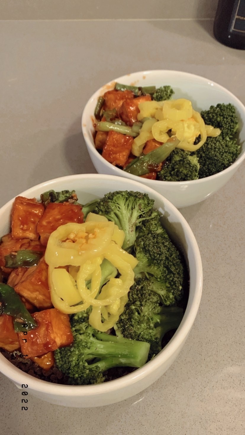 Before you start your tofu, put your broccoli on to steam and get that started. Also cook your quinoa according to the package and set aside.