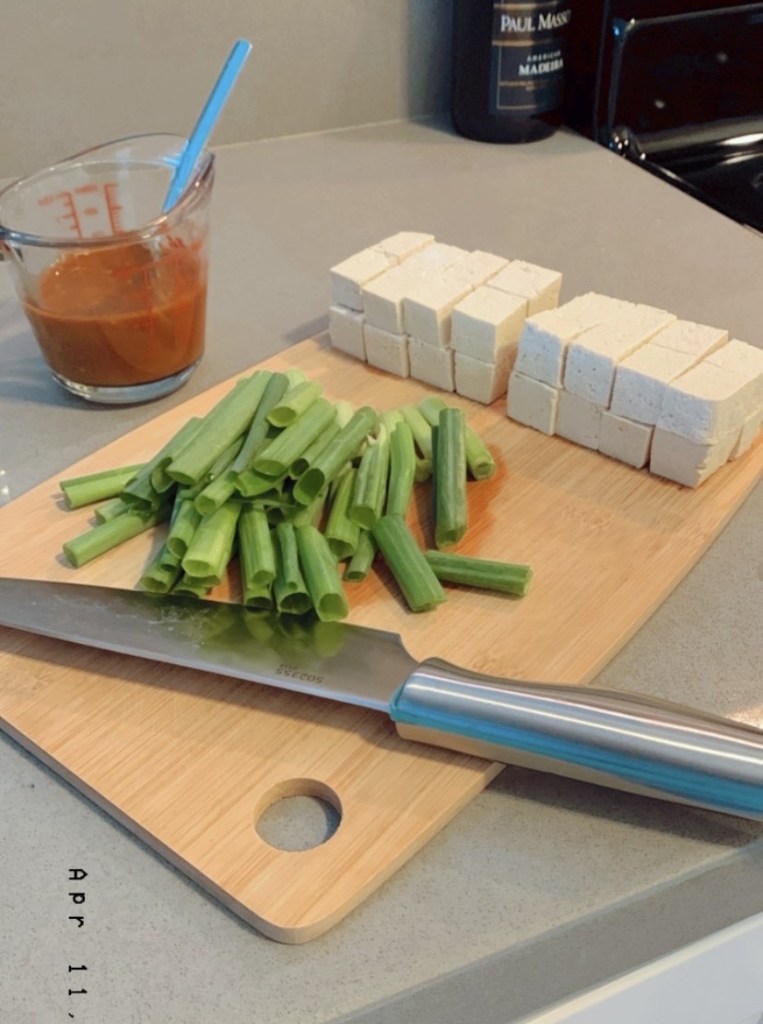 First prep your ingredients and sauce! Make sure you press your tofu to get out the excess water & pat dry. Then dice into even sized cubes. Also shown is my green onions chopped- throw these in right before you add your sauce. Not shown is my broccoli cut and ready to be steamed.
