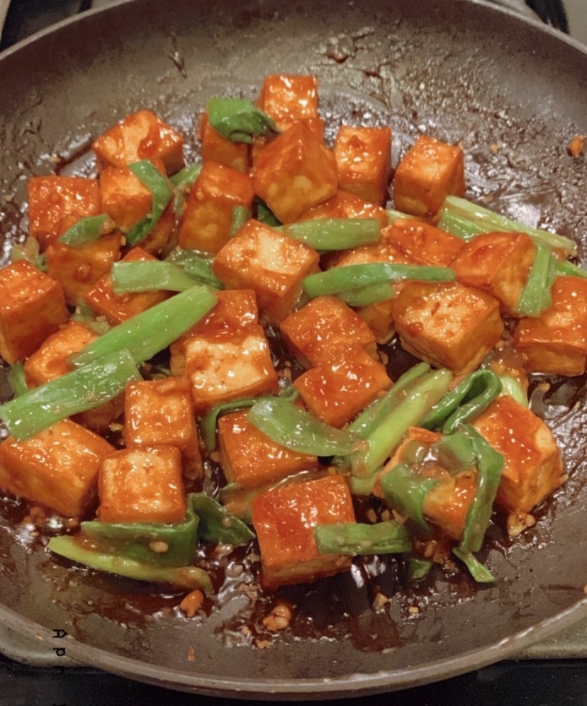 Finished teriyaki tofu with green onions. Top with sesame seeds