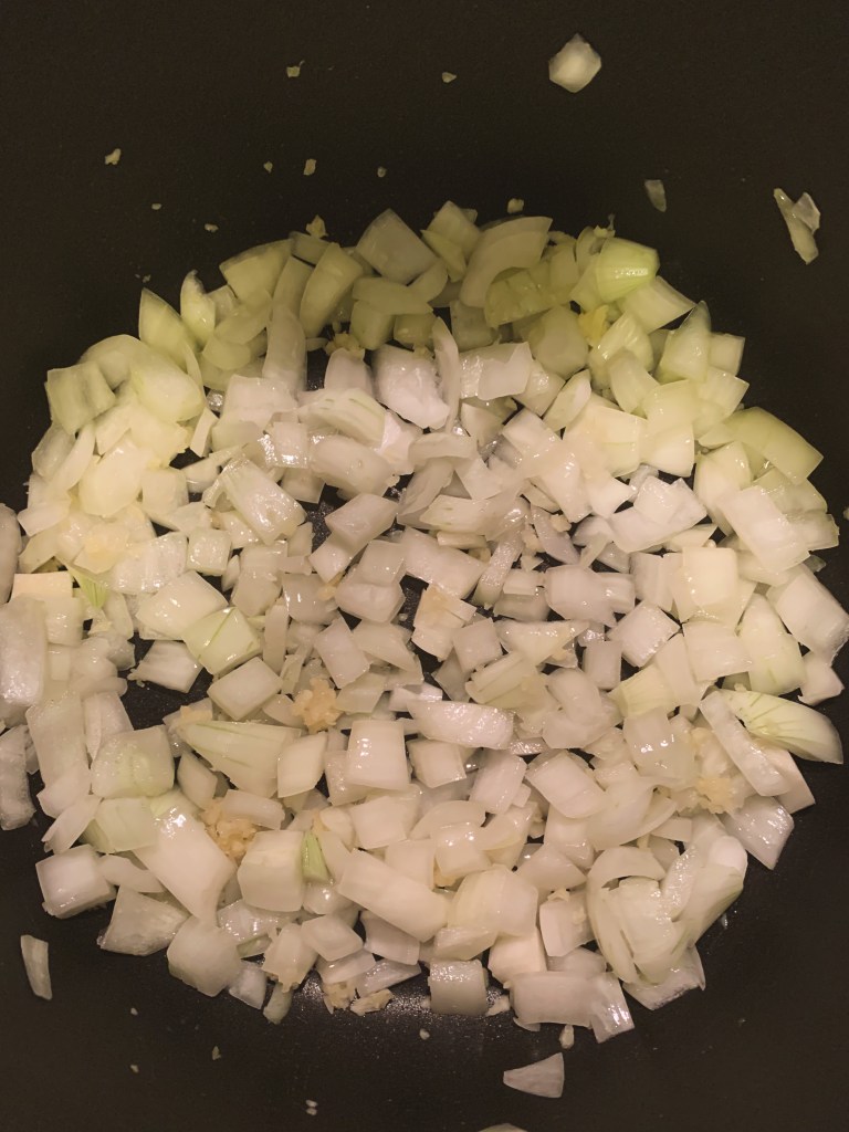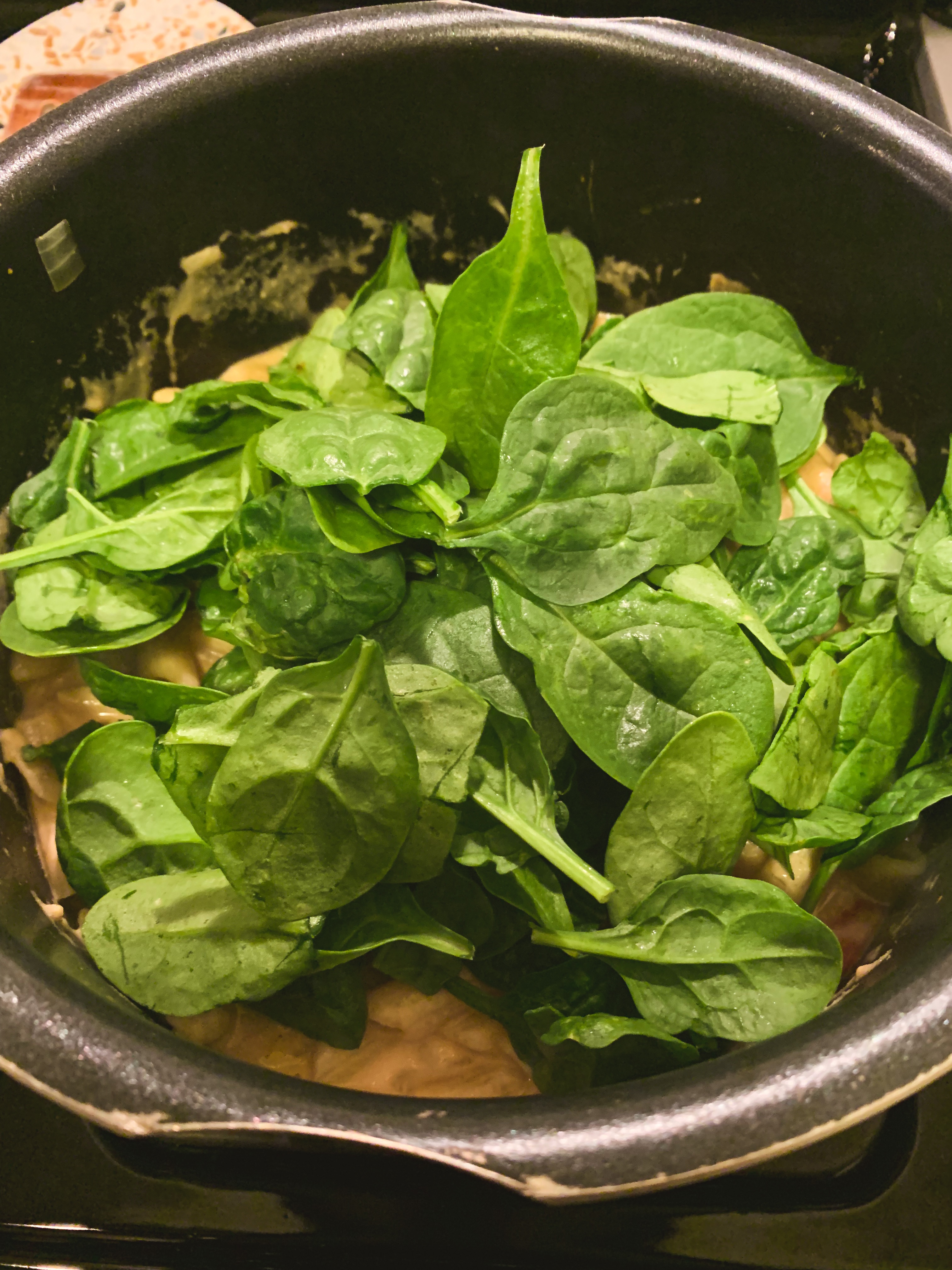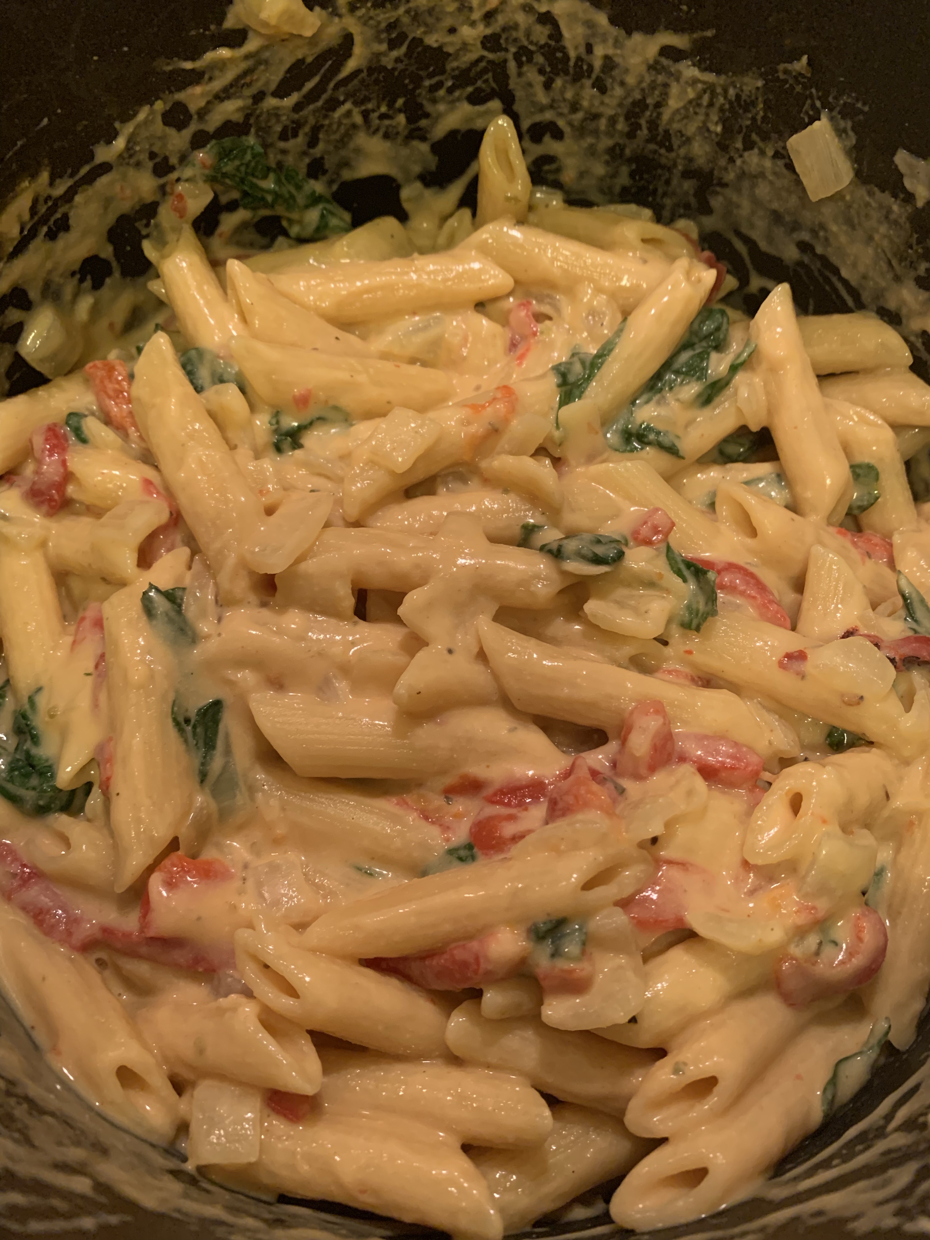 my cashew cream blended onions and garlic I accidentally added 5 cups of veggie broth instead of 3 but it turned out great (:the pasta will start soaking up the veggie broth. Make sure to stir occasionally to keep pasta from sticking to the bottom. add your cashew cream once your pasta is allllmost to your liking also throw in your spinach and stir it all up good. Put a lid on and let the spinach wilt and the pasta finish cookingfinished pasta top with fresh basil