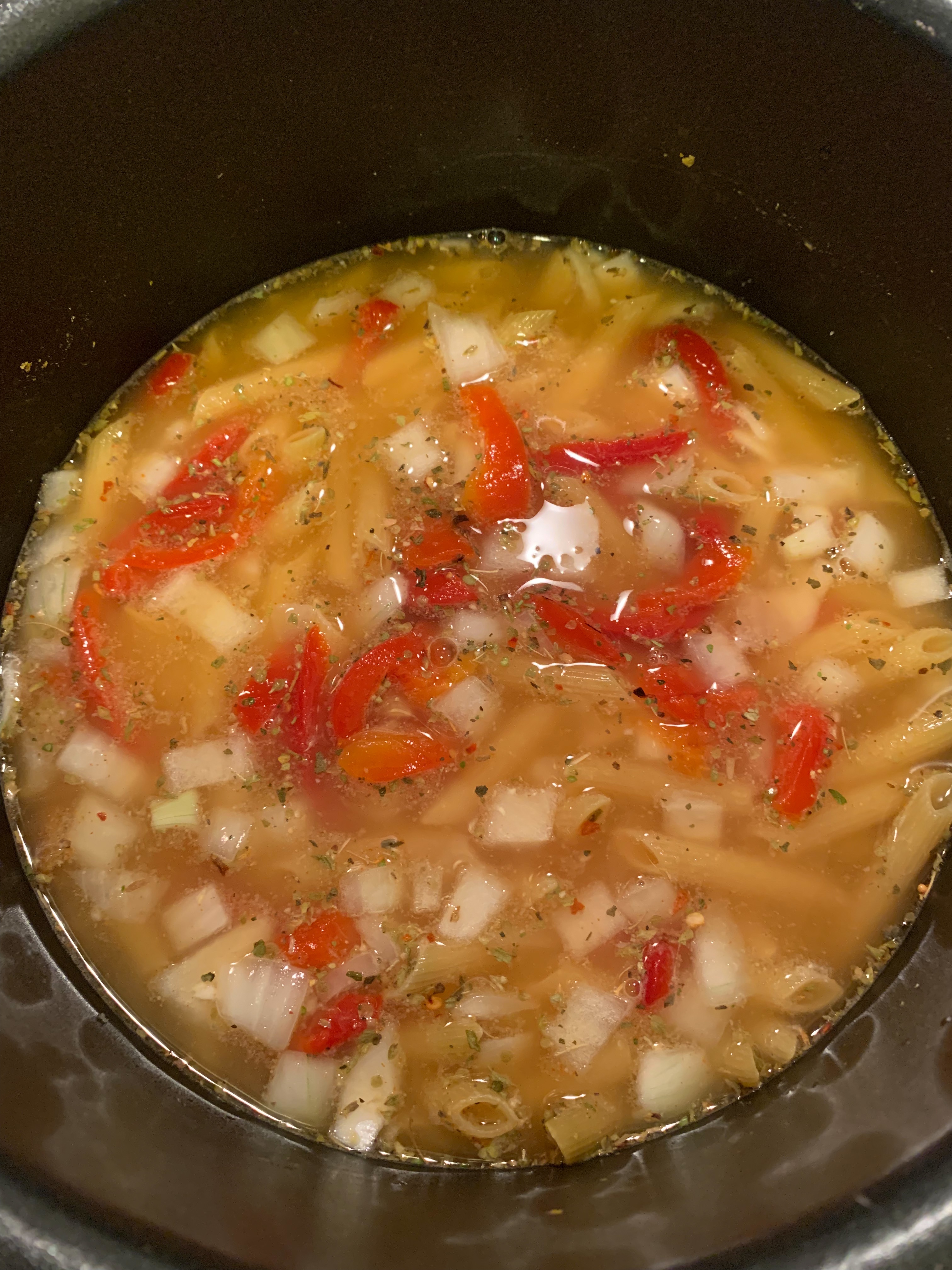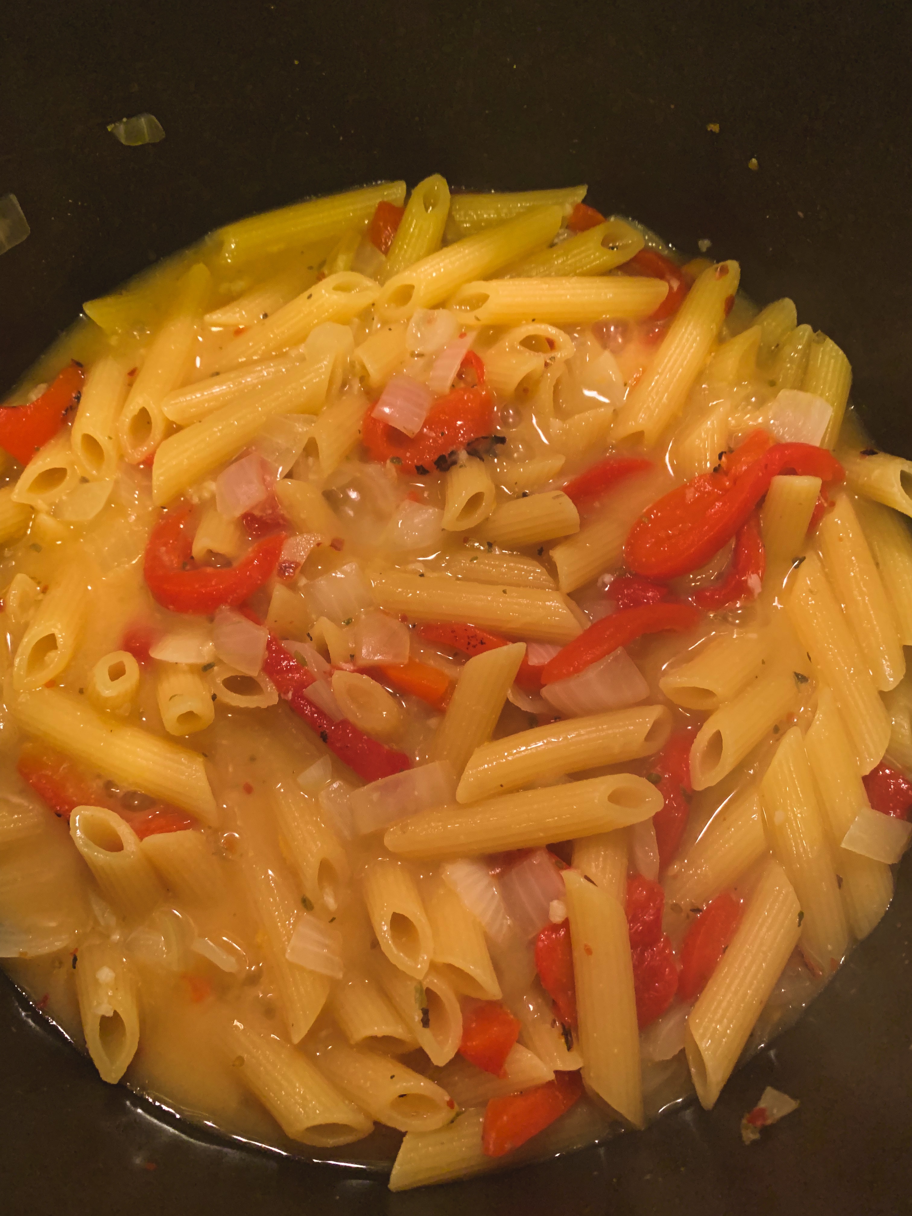 In a big pot on medium heat add your onion and garlic, sauté 1-2 minutes until fragrant. Add 3 cups veggie broth (you can add up to 5 cups veggie broth max), penne pasta, roasted red peppers, oregano, salt, red pepper flakes, & nutritional yeast. Mix well and cover with a lid and bring to a strong simmer. Stir occasionally and mix the pasta so it all cooks even and doesn’t stick to the bottom of the pan. About 15-20min. When pasta is almost to your liking for texture, add the cashew sauce and spinach and cook with the lid on until pasta is soft and spinach is wilted. Serve topped with fresh basil. + I like eating this dinner with a side of steamed broccoli 🥦